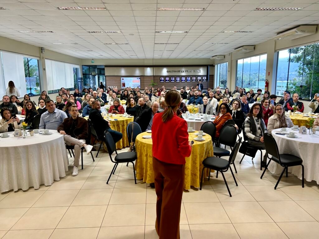 A CIC Teutônia realizou na manhã desta quarta-feira, 27 de agosto, mais uma edição do Café da Manhã Empresarial, reunindo quase 150 participantes no auditório da entidade. O encontro iniciou com as boas-vindas do vice-presidente da Indústria da CIC, Diogo Fernando Dickel, que destacou a alegria em ver a casa cheia e reforçou que a forte adesão dos associados confirma que a entidade está no caminho certo ao atender suas necessidades.