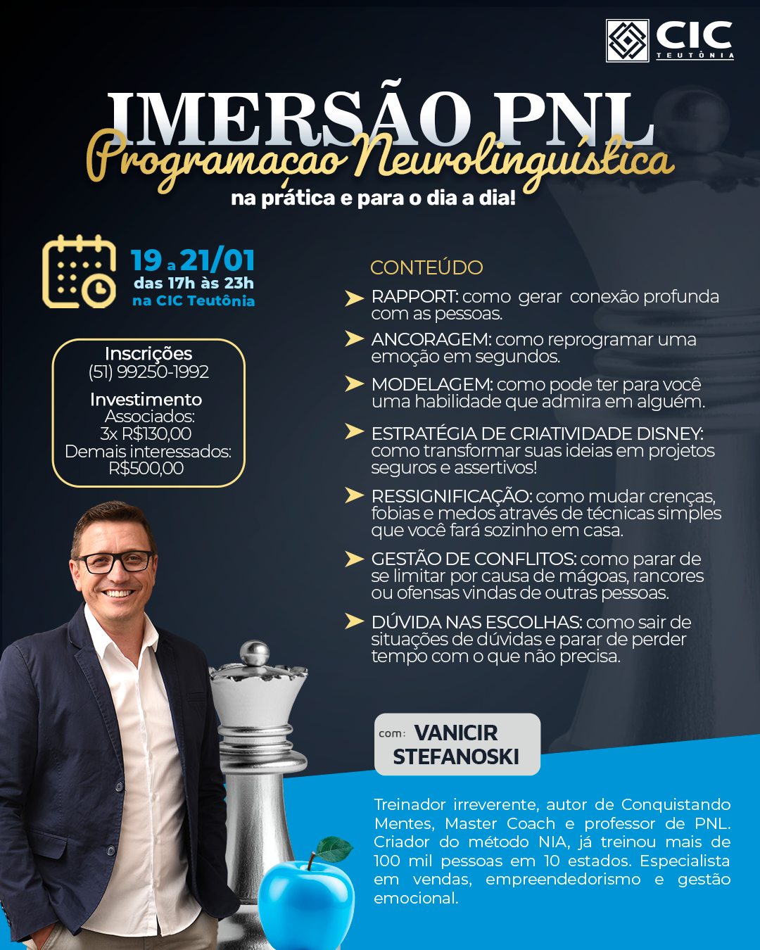 A CIC Teutônia está com inscrições abertas para a Imersão em Programação Neurolinguística (PNL), que ocorre de 19 a 21 de janeiro, das 17h às 23h, na sede da entidade. Com o tema “Programação Neurolinguística na prática e para o dia a dia”, a formação será conduzida por Vanicir Stefanoski, autor do livro Conquistando Mentes, Master Coach e professor de PNL, e é voltada a quem busca ferramentas práticas para melhorar comunicação, foco, equilíbrio emocional e tomada de decisões, tanto na vida pessoal quanto no ambiente profissional.
