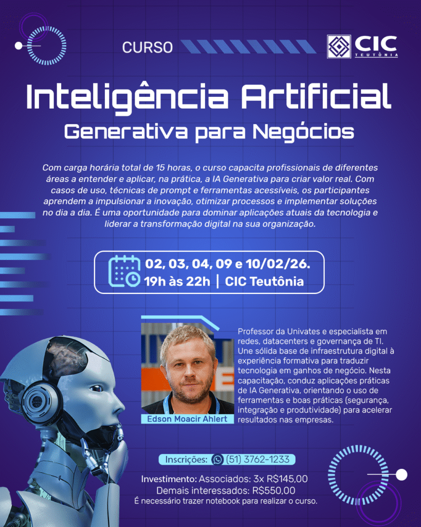 Instrutor: Edson Moacir Ahlert é professor da Univates e especialista em redes, datacenters e governança de TI. Une sólida base de infraestrutura digital à experiência formativa para traduzir tecnologia em ganhos de negócio. Nesta capacitação, conduz aplicações práticas de IA Generativa, orientando o uso de ferramentas e boas práticas (segurança, integração e produtividade) para acelerar resultados nas empresas.