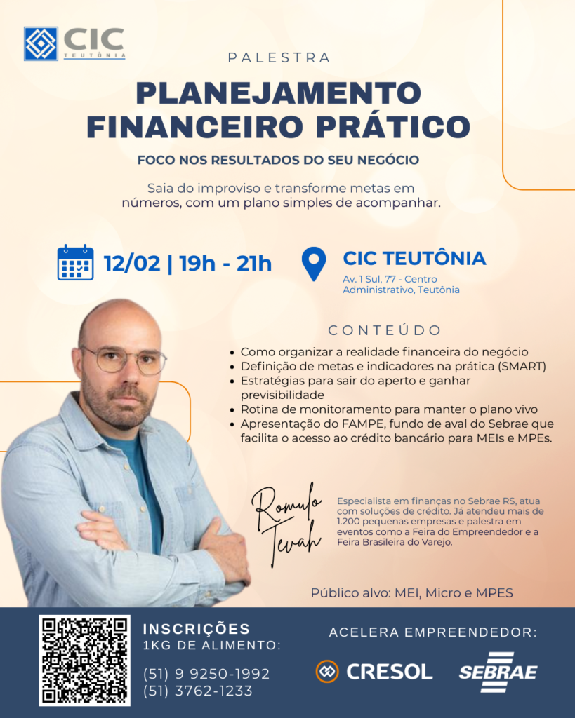 Palestrante: Romulo Tevah: Especialista em finanças no Sebrae RS, atua com soluções de crédito. Já atendeu mais de 1.200 pequenas empresas e palestra em eventos como a Feira do Empreendedor e a Feira Brasileira do Varejo.