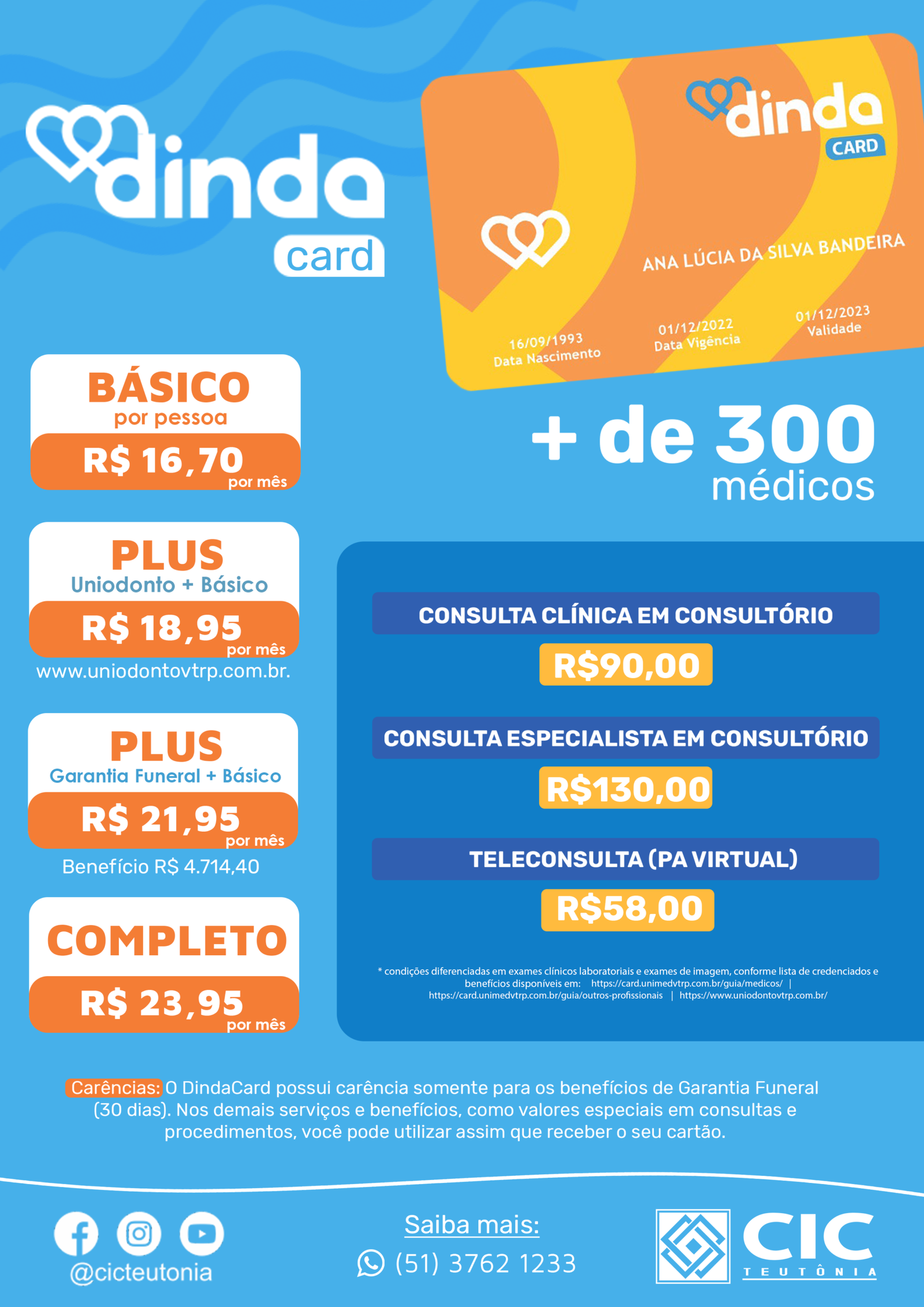 Condições diferenciadas em exames clínicos laboratoriais e exames de imagem. O Dinda Card possui carência somente para os benefícios de Garantia Funeral (30 dias). Nos demais serviços e benefícios, como valores especiais em consultas e procedimentos, você pode utilizar assim que receber o seu cartão.